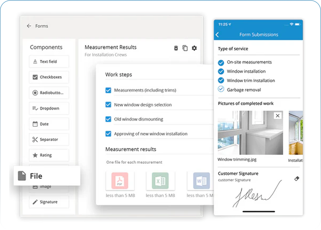 Attach customizable forms for tasks, allowing employees to capture data like photos, signatures, and inspection reports